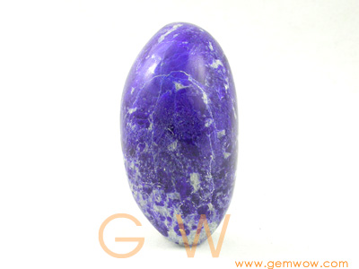 这块青金石不同于普通常见的地方在于,它是来自缅甸的而它本事几乎没有黄铁矿。石头的顶部些皇家蓝的颜色,是来自于青金石矿,还有的地方伴有深蓝色的方钠石。形状和抛光打磨都不错,是值得收藏的矿标。