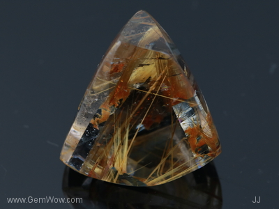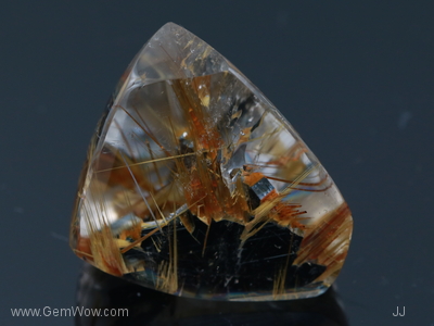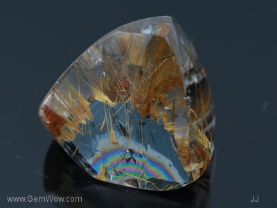Golden needles "captured" in clear "ice"! Iridescent "rainbow" in a half circle pattern highlights this piece. A piece is looking for an owner with an appreciation for nature's unique creations! |