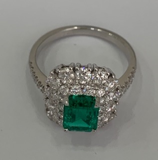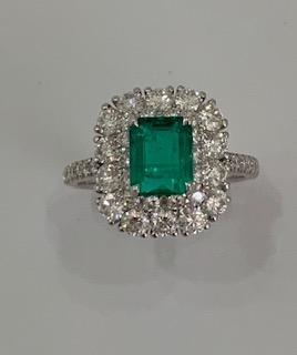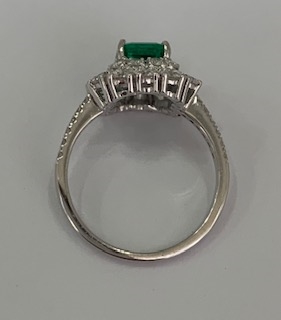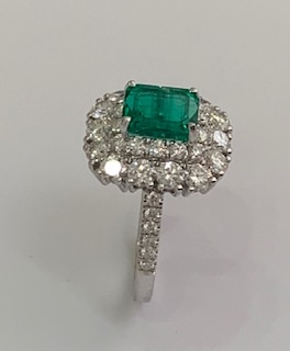 Vintage inspired emerald diamond ring, emerald 1.27 ct and diamond 1.36 ct in 18K white gold