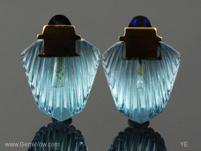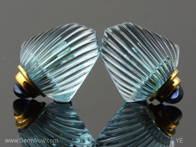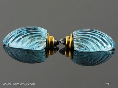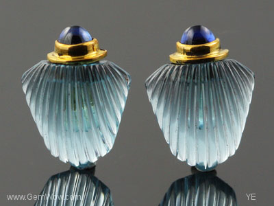这是一对儿吸引人的雕刻蓝托帕石。形状很像贝壳。顶部是深蓝色的宝石头,黄金镶嵌。