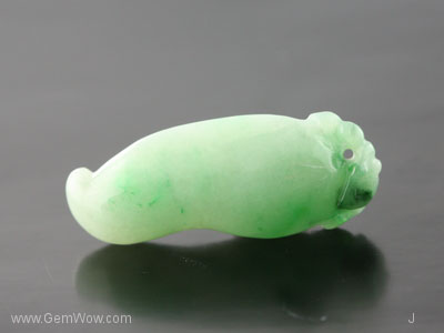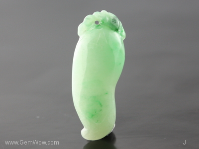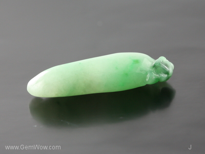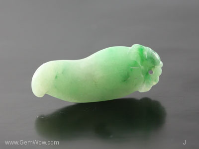หยกเจดไดร์ทแกะสลักรูปพริก มีสีเขียวอ่อนเกือบเขียวกลางๆ ออกไปทางสีเขียวแอปเปิล เนื้อดีโปร่งใส ได้รับการขัดเงามาอย่างดีมาก |