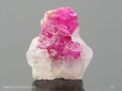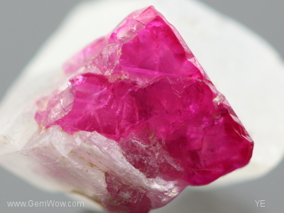 这个附着在其母体方解石上的的缅甸抹谷红宝石矿晶,是半透明的矿晶。