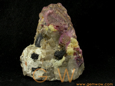 A beautiful mineralogical piece. This specimen contains some \"mushroom tourmaline\" crystals taken in a feldspar rock and combinated to quartz crystals. \"Mushroom tourmaline\" crystals grew together (you can see the columnar schorl seeds) or one above the other, forming an original shape. A fine reference specimen. la/kc