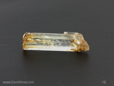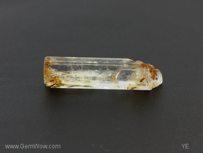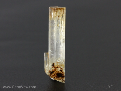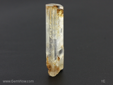 A well formed hexagonal beryl crystal with pinacoid termination. This specimen shows a small twin near the base and patchy staining along its length.