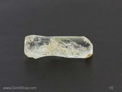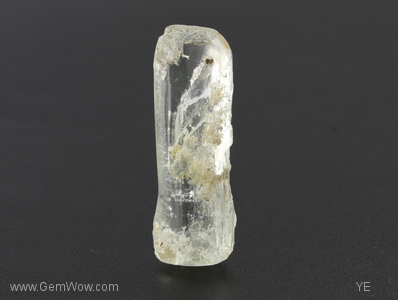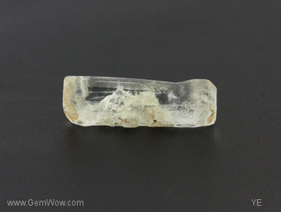 Dogbone shaped aquamarine. Here is a colorless beryl with a funny shape. This specimen does not show the strong prism faces normally seen. Instead, it has a more-or-less triangular cross-section and many skinny faces running its length. The really unusual feature is how the stone tapers in and then back out again as you pass down its length. It is mostly transparent with a deep hole in one side. Don't feed this one to your dog!! |