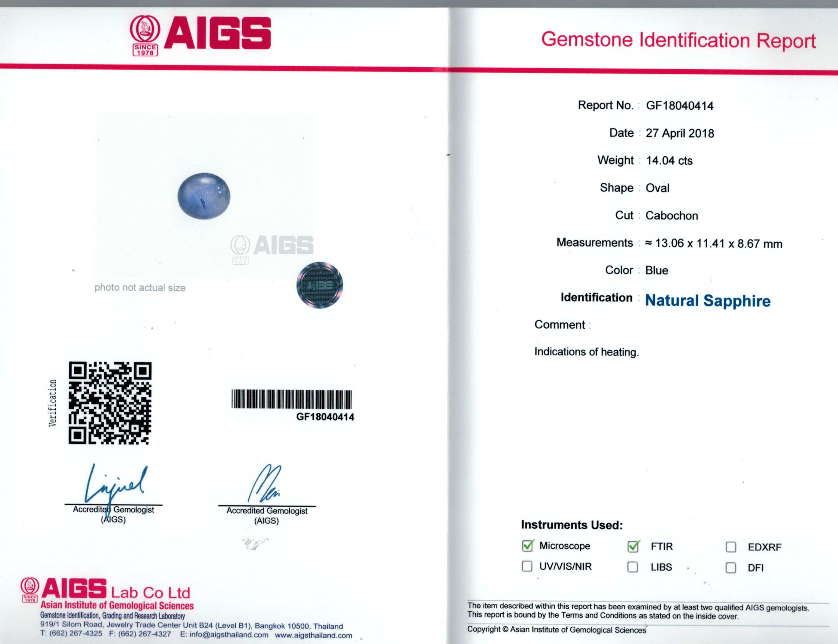 AIGS report No. GF18040414