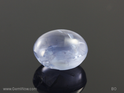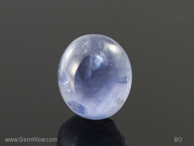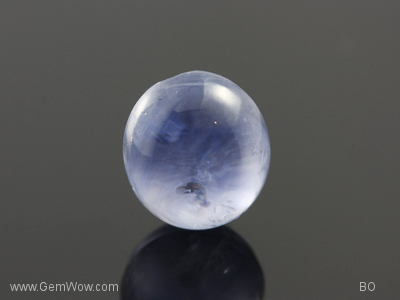 A transparent "jelly bean" line cab sapphire with weak asterism. Distinct cluster of disc like halo inclusions. Pavilion has 3 medium to larger cavities. A bluff and playful stone that can be bought inexpensively.