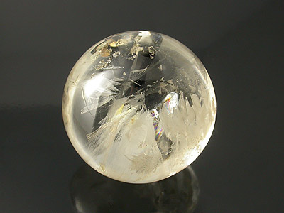 这是一个较为扁的托帕石水晶球来自于抹谷缅甸。这个结构和里面的包裹体允许你对其内部进行研究。里面可以看到彩虹般的荷叶包裹体、白色吸管样的包裹体、平行的针状包裹体、以及指纹和薄薄的面纱包裹体,非常值得研究学习。 |