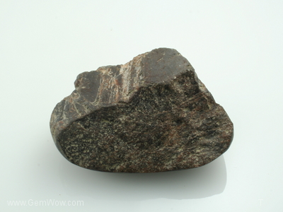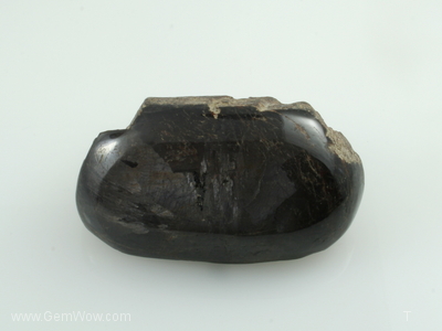 A rugged piece of bronzy variety of sapphire from Mogok. Weighs 936 carats, part cab part rough, the stone exposes the material beneath the polished areas. The back side reveals growth striations and the silk formations are geometric in its patterns. A study stone.