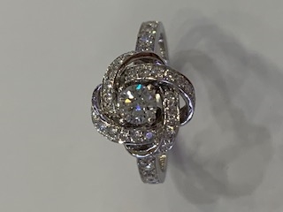 One bow ribbin ring with centered diamond .28 ct set with pave diamond .47 ct in 18K white gold