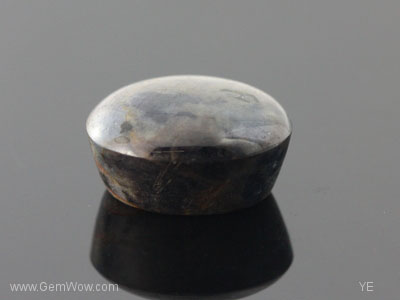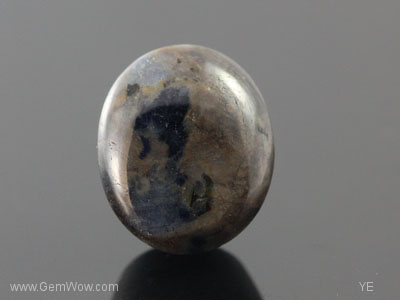 Dark blotches against bronzy metallic looking rutile background gives a contrasting appearance. Very faint asterism. Nice as sample. (LA)